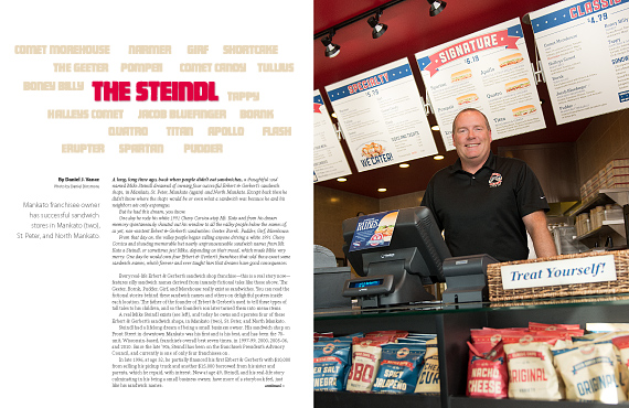 A long, long time ago, back when people didn’t eat sandwiches, a thoughtful soul named Mike Steindl dreamed of owning four successful Erbert & Gerbert’s sandwich shops, in Mankato, St. Peter, Mankato (again) and North Mankato. Except back then he didn’t know where the shops would be or even what a sandwich was because he and his neighbors ate only asparagus.