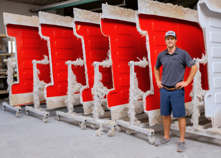 Blackhawk Fiberwerx owner, Tyler Deike, in front of his fiberglass production line. (Photo by Jonathan Smith) Engineering Entrepreneurism Organization, Education